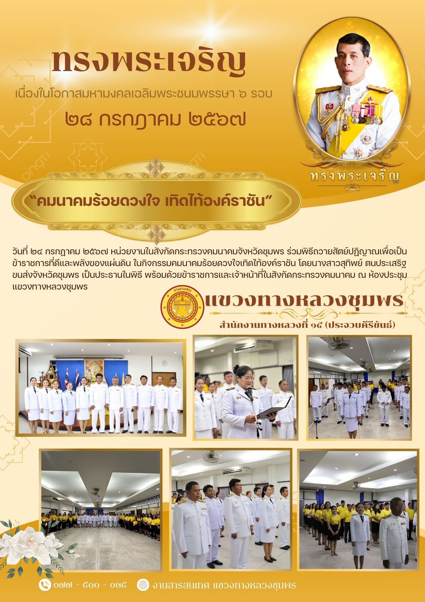 แขวงทางหลวงชุมพร ขอเชิญชวนประชาชนร่วมลงนามถวายพระพร พระบาทสมเด็จพระเจ้าอยู่หัว เนื่องในโอกาสวันเฉลิมพระชนมพรรษา วันที่ ๒๘ กรกฎาคม ๒๕๖๔ ผ่านระบบออนไลน์
