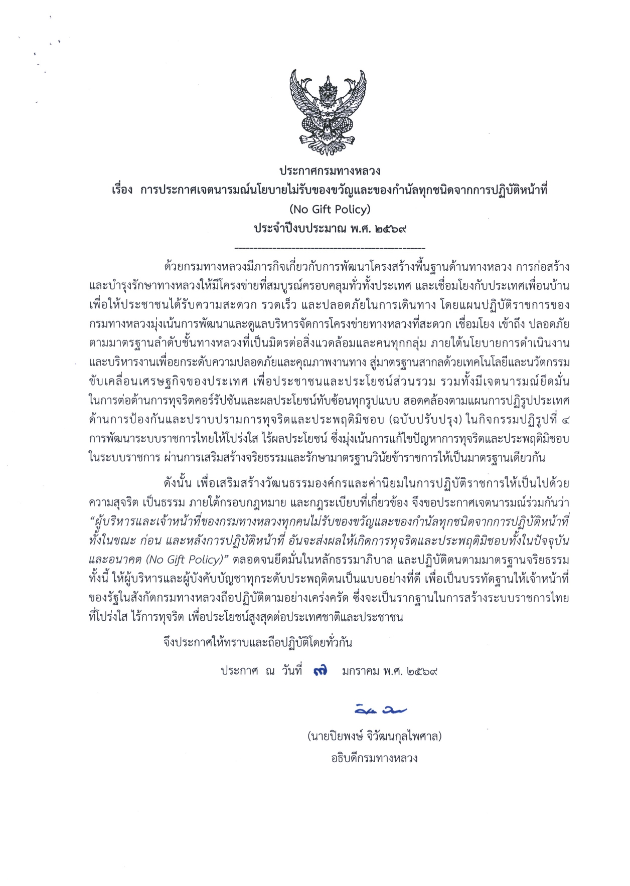 4 23/01/2569 ประกาศเจตนารมณ์นโยบายไม่รับของขวัญและของกำนัลทุกชนิดจากการปฏิบัติหน้าที่ (No Gift Policy) ประจำปีงบประมาณ พ.ศ. 2569