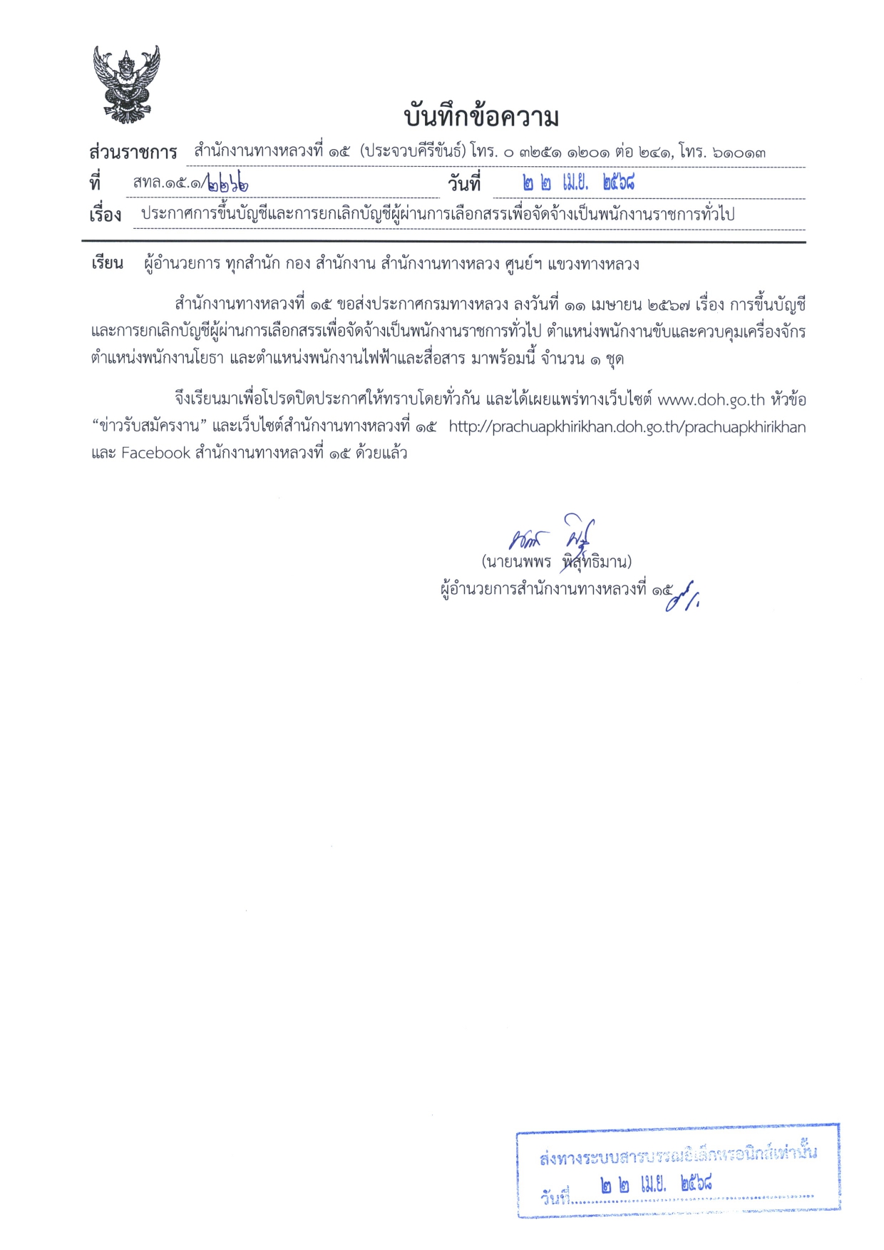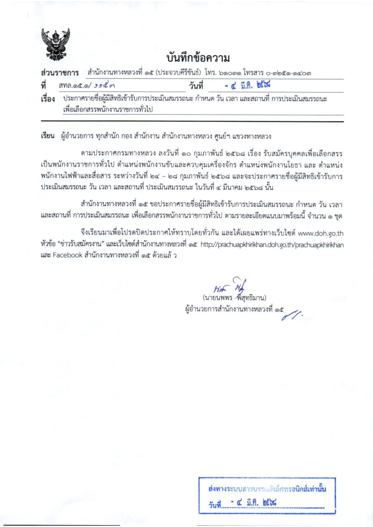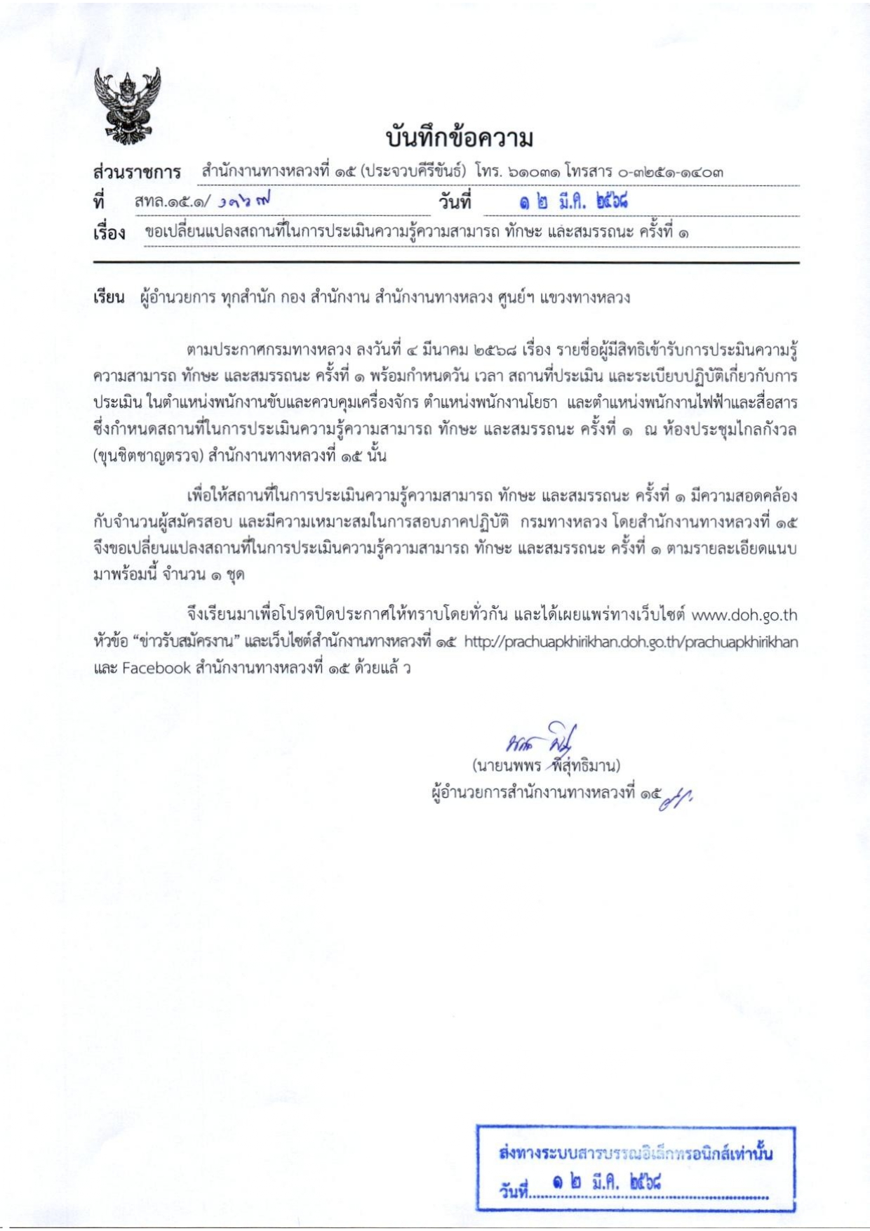 สำนักงานทางหลวงที่ 15 (ประจวบคีรีขันธ์) ขอแจ้งเปลี่ยนแปลงสถานที่ในการ การประเมินสมรรถนะ เพื่อเลือกสรรพนักงานราชการทั่วไป ครั้งที่ 1 ในตำแหน่งพนักงานขับและควบคุมเครื่องจักร ตำแหน่งพนักงานโยธา และ ตำแหน่งพนักงานไฟฟ้าและสื่อสาร