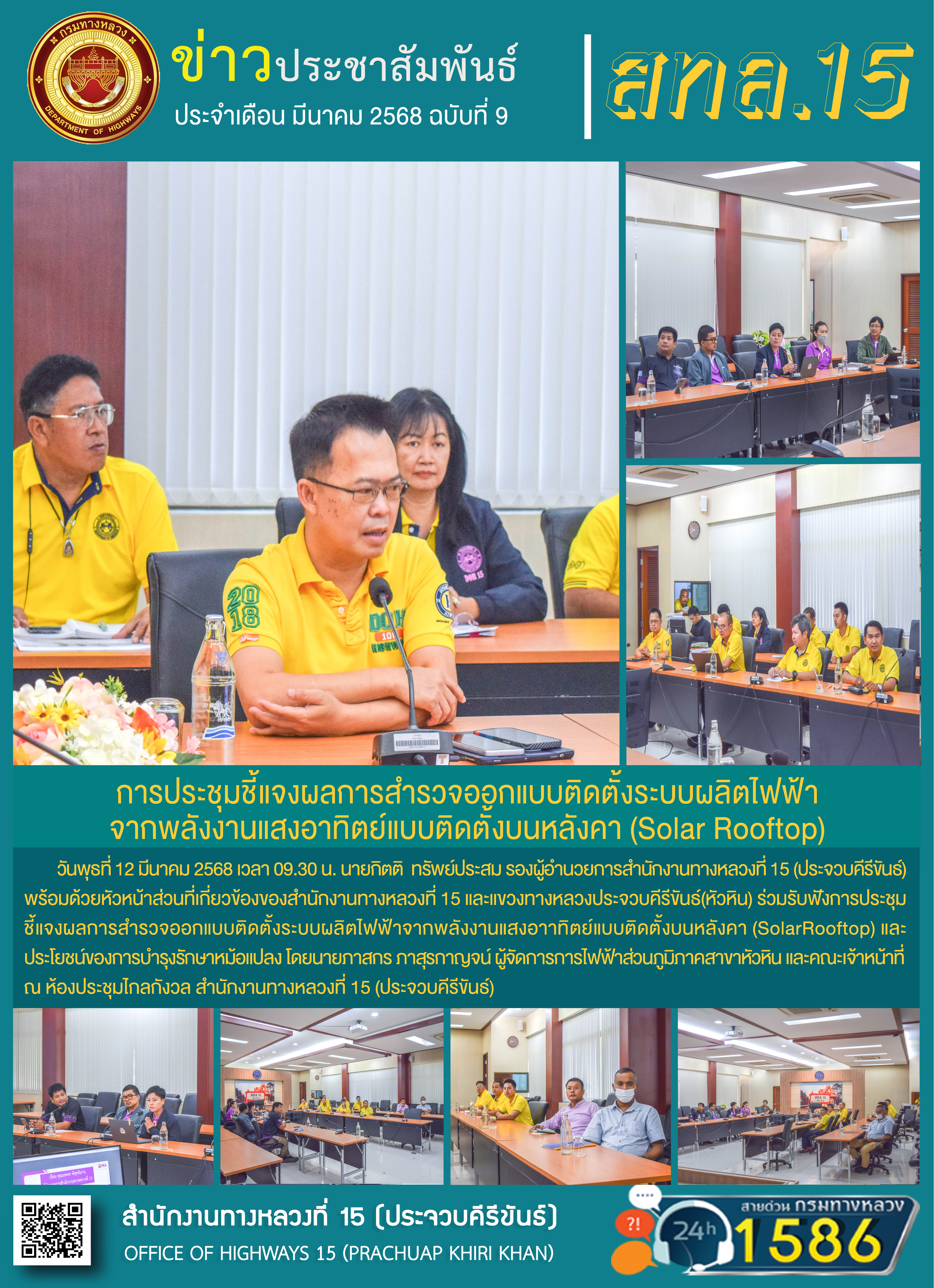 วันที่ 12 มีนาคม 2568 เวลา 9.30 น. นายกิตติ ทรัพย์ประสม รองผู้อำนวยการสำนักงานทางหลวงที่ 15 พร้อมด้วยหัวหน้าส่วนที่เกี่ยวข้องของสำนักงานทางหลวงที่ 15 และแขวงทางหลวงประจวบคีรีขันธ์(หัวหิน) ร่วมรับฟังการประชุมชี้แจงผลการสำรวจออกแบบติดตั้งระบบผลิดไฟฟ้าจากพลังงานแสงอาทิตย์แบบติดตั้งบนหลังคา (Solar Rooftop) และประโยชน์ของการบำรุงรักษาหม้อแปลง โดยนายภาสกร ภาสุรกาญจน์ ผู้จัดการการไฟฟ้าส่วนภูมิภาคสาขาหัวหิน และคณะเจ้าหน้าที่ ณ ห้องประชุมไกลกังวล สำนักงานทางหลวงที่ 15 (ประจวบคีรีขันธ์)