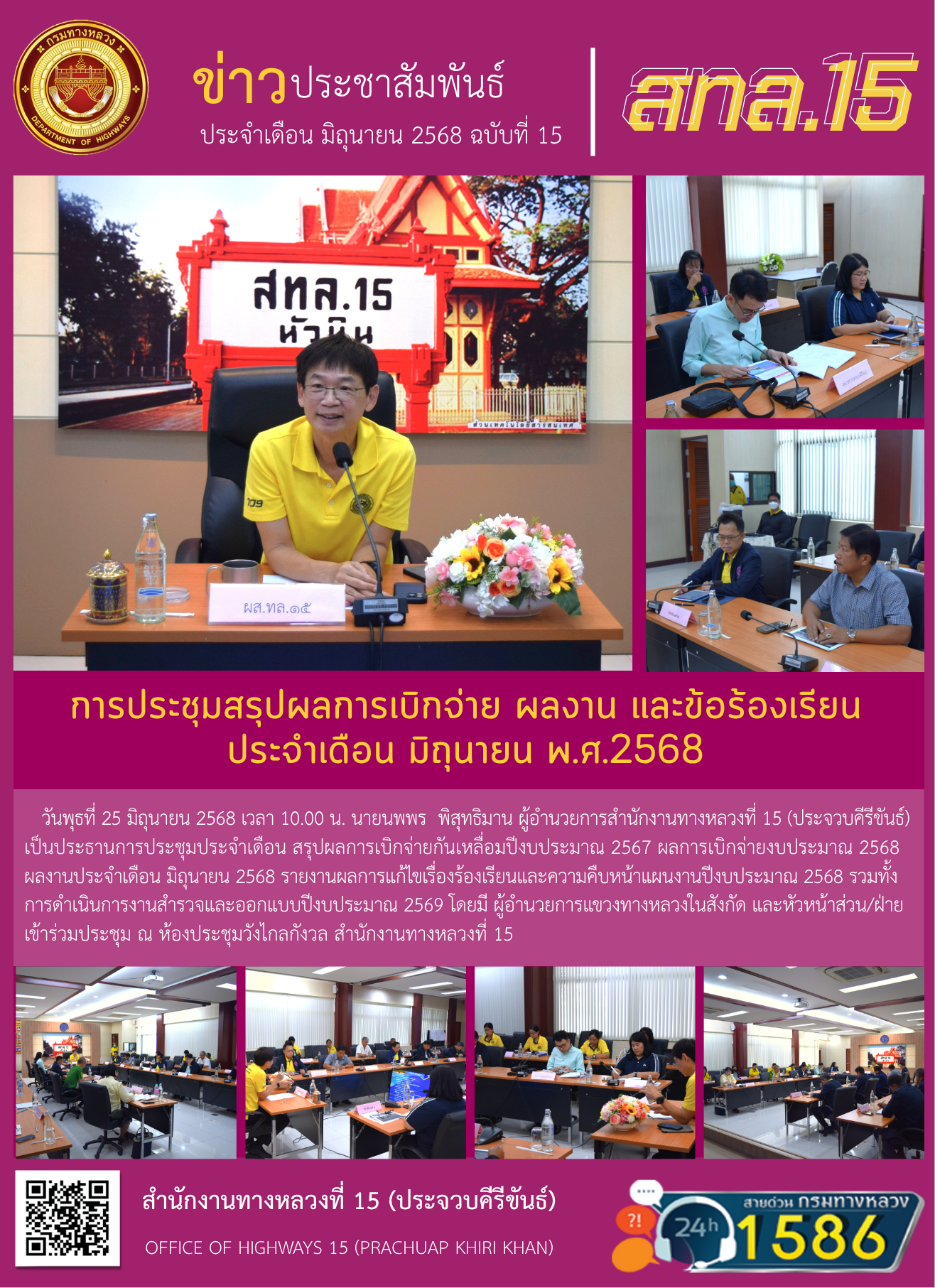 วันพุธที่ 25 พฤษภาคม 2568 เวลา 10.00 น. นายนพพร พิสุทธิมาน ผู้อำนวยการสำนักงานทางหลวงที่ 15 (ประจวบคีรีขันธ์)เป็นประธานการประชุมประจำเดือน สรุปผลการเบิกจ่ายกันเหลื่อมปีงบประมาณ 2567 ผลการเบิกจ่ายงบประมาณ 2568 ผลงานประจำเดือน มิถุนายน 2568 รายงานผลการแก้ไขเรื่องร้องเรียนและความคืบหน้าแผนงานปีงบประมาณ 2568 รวมทั้งการดำเนินการงานสำรวจและออกแบบปีงบประมาณ 2569 โดยมี ผู้อำนวยการแขวงทางหลวงในสังกัด และหัวหน้าส่วน/ฝ่ายเข้าร่วมประชุม ณ ห้องประชุมวังไกลกังวล สำนักงานทางหลวงที่ 15