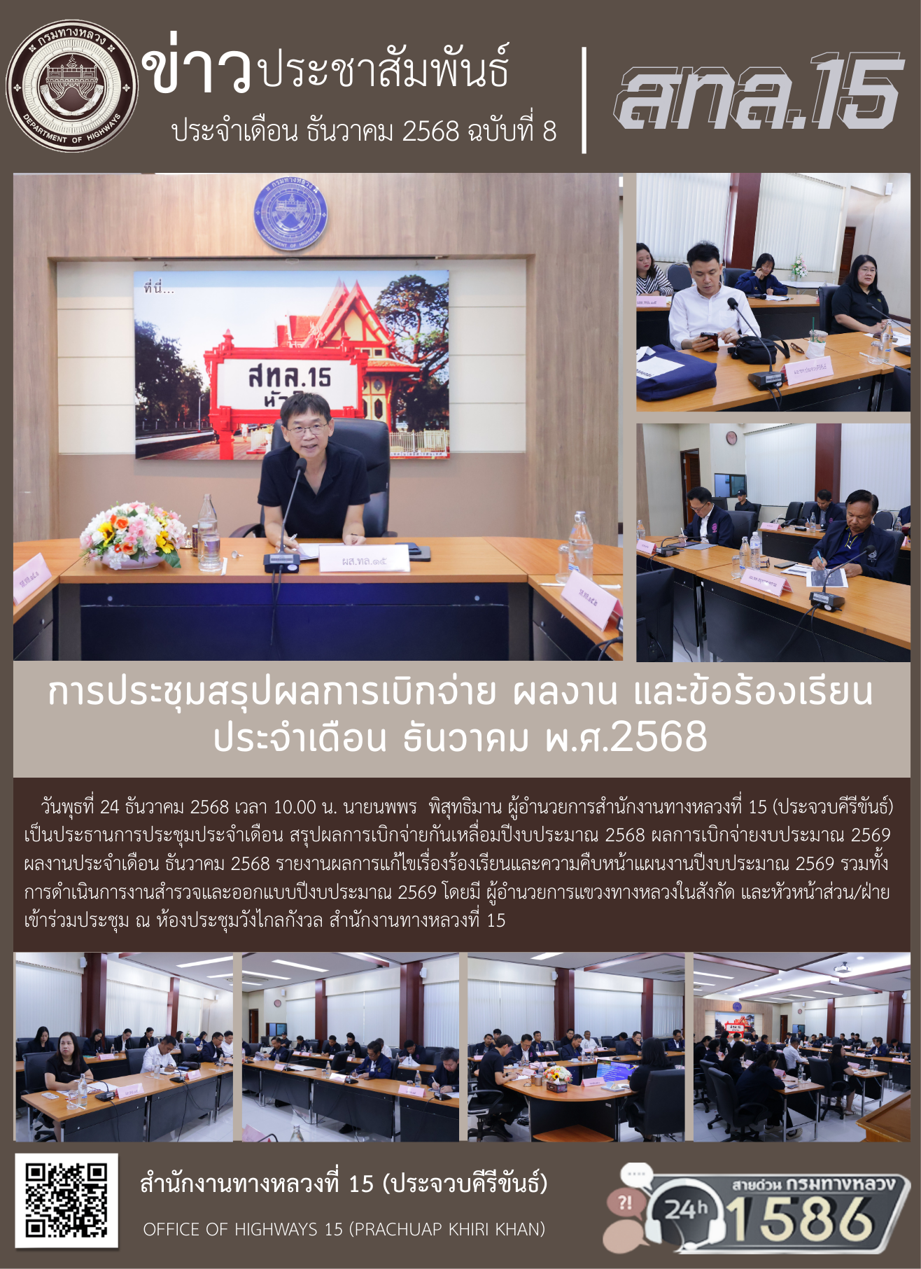 วันพุธที่ 24 ธันวาคม 2568 เวลา 10.00 น. นายนพพร พิสุทธิมาน ผู้อำนวยการสำนักงานทางหลวงที่ 15 (ประจวบคีรีขันธ์) เป็นประธานการประชุมประจำเดือน สรุปผลการเบิกจ่ายกันเหลื่อมปีงบประมาณ 2568 ผลการเบิกจ่ายงบประมาณ 2569 ผลงานประจำเดือน ธันวาคม 2568 รายงานผลการแก้ไขเรื่องร้องเรียนและความคืบหน้าแผนงานปีงบประมาณ 2569 รวมทั้งการดำเนินการงานสำรวจและออกแบบปีงบประมาณ 2569 โดยมี ผู้อำนวยการแขวงทางหลวงในสังกัด และหัวหน้าส่วน/ฝ่าย เข้าร่วมประชุม ณ ห้องประชุมวังไกลกังวล สำนักงานทางหลวงที่ 15