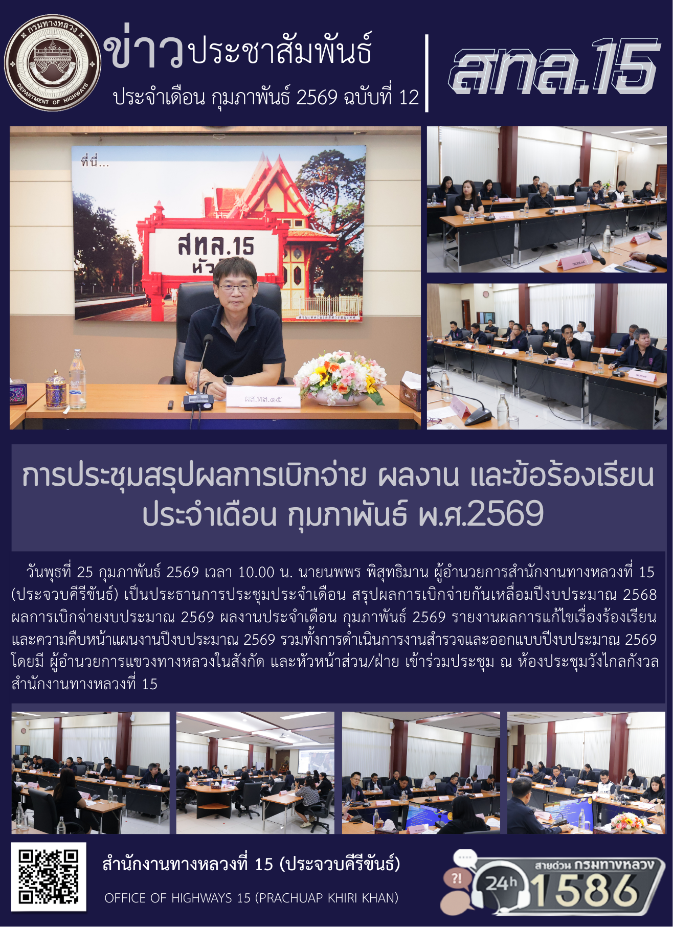 วันพุธที่ 25 กุมภาพันธ์ 2569 เวลา 10.00 น. นายนพพร พิสุทธิมาน ผู้อำนวยการสำนักงานทางหลวงที่ 15 (ประจวบคีรีขันธ์) เป็นประธานการประชุมประจำเดือน สรุปผลการเบิกจ่ายกันเหลื่อมปีงบประมาณ 2568 ผลการเบิกจ่ายงบประมาณ 2569 ผลงานประจำเดือน กุมภาพันธ์ 2569 รายงานผลการแก้ไขเรื่องร้องเรียน และความคืบหน้าแผนงานปีงบประมาณ 2569 รวมทั้งการดำเนินการงานสำรวจและออกแบบปีงบประมาณ 2569 โดยมี ผู้อำนวยการแขวงทางหลวงในสังกัด และหัวหน้าส่วน/ฝ่าย เข้าร่วมประชุม ณ ห้องประชุมวังไกลกังวล สำนักงานทางหลวงที่ 15