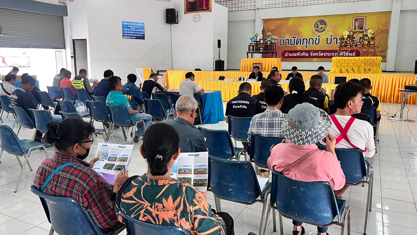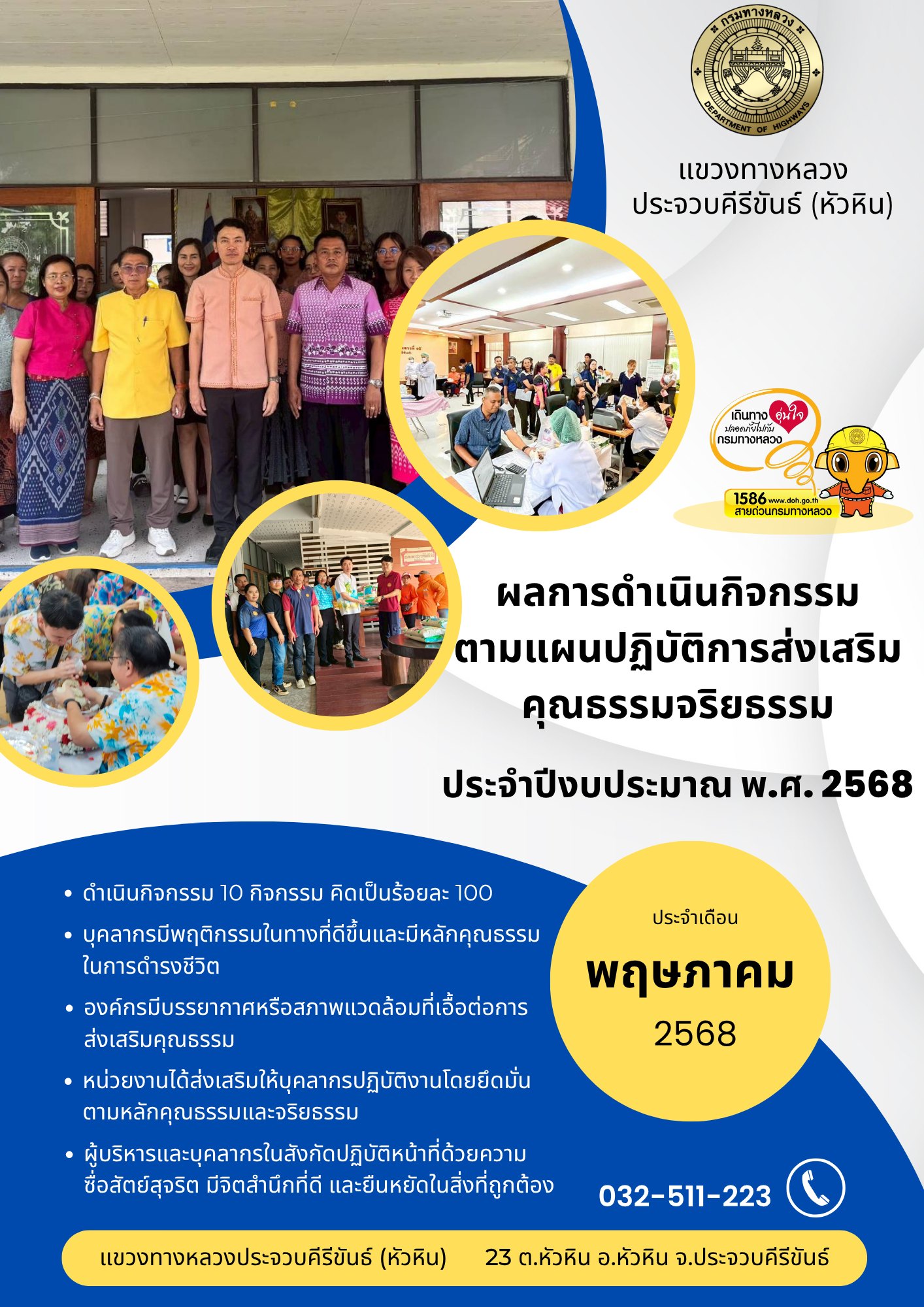 การดำเนินงานการมีส่วนร่วมของประชาชน เพื่อประชาสัมพันธ์ โครงการก่อสร้างโครงข่ายทางหลวงแผ่นดิน กิจกรรมก่อสร้างทางหลวงผ่านชุมชนเพื่อคนทุกกลุ่ม ทางหลวงหมายเลข 3218 ตอน หัวหิน – โป้งแย้ ระหว่าง กม.1+150 - กม.2+500