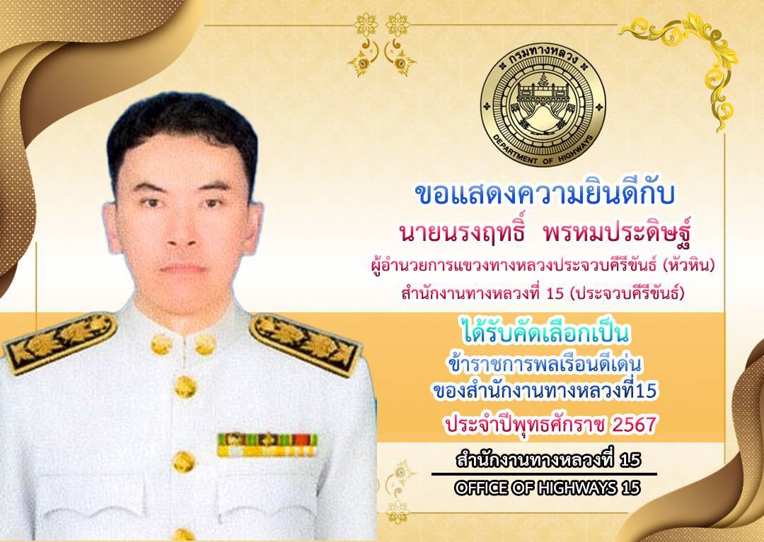 ขอแสดงความยินดีกับ นายนรงฤทธิ์ พรหมประดิษฐ์ ผู้อำนวยการแขวงทางหลวงประจวบคีรีขันธ์ (หัวหิน) ได้รับคัดเลือกเป็นข้าราชการพลเรือนดีเด่นของสำนักงานทางหลวงที่ 15 ประจำปี 2567