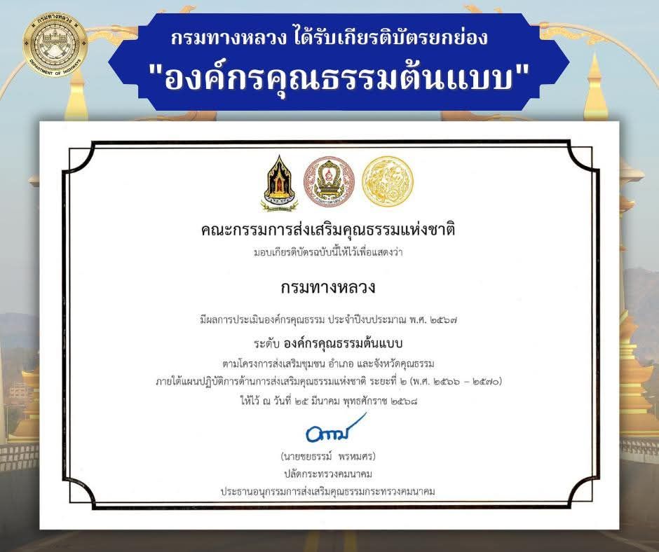 ขอประกาศยกย่องเชิดชูกรมทางหลวง ซึ่งได้รับเกียรติบัตรจากคณะกรรมการส่งเสริมคุณธรรมแห่งชาติ โดยมีผลการประเมินองค์กรคุณธรรม ประจำปีงบประมาณ 2567 อยู่ในระดับ "องค์กรคุณธรรมต้นแบบ"